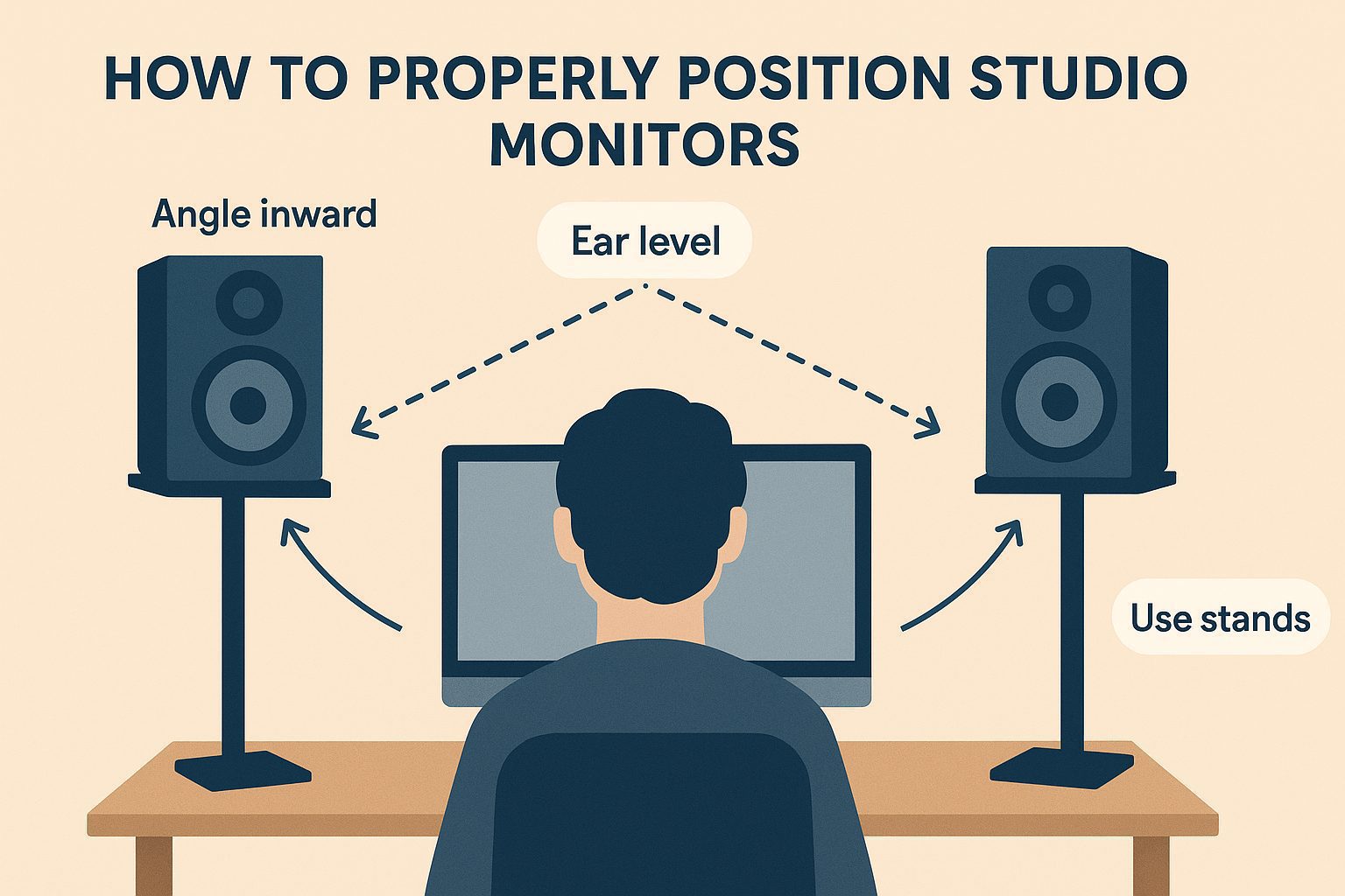 - Distance: The distance between the monitors should be the same as the distance from each monitor to your ears—usually about 3 to 5 feet (1–1.5 meters).