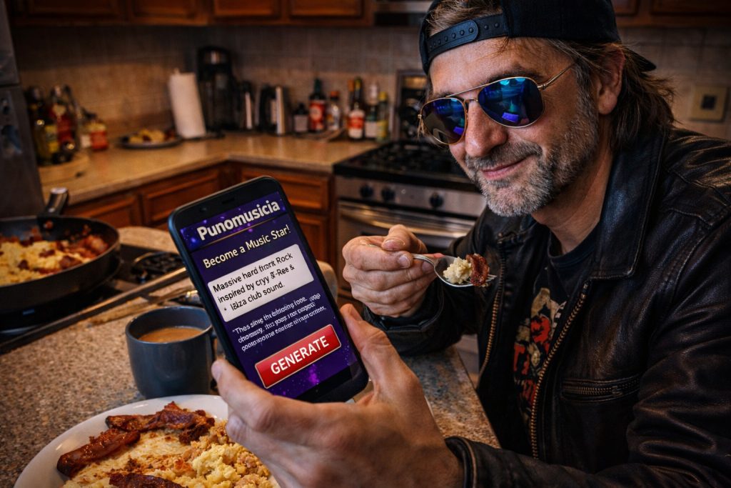 His artistic awakening did not come through discipline, practice, or a renewed love of musical expression. It came through prompting. Because why spend years learning harmony, rhythm, composition, arrangement, performance, or anything remotely musical when a website can generate thousands of tracks while you sit in a chair and type things like “prehistoric fusion rap with emotional cave drums and accordion metal breakdown”?